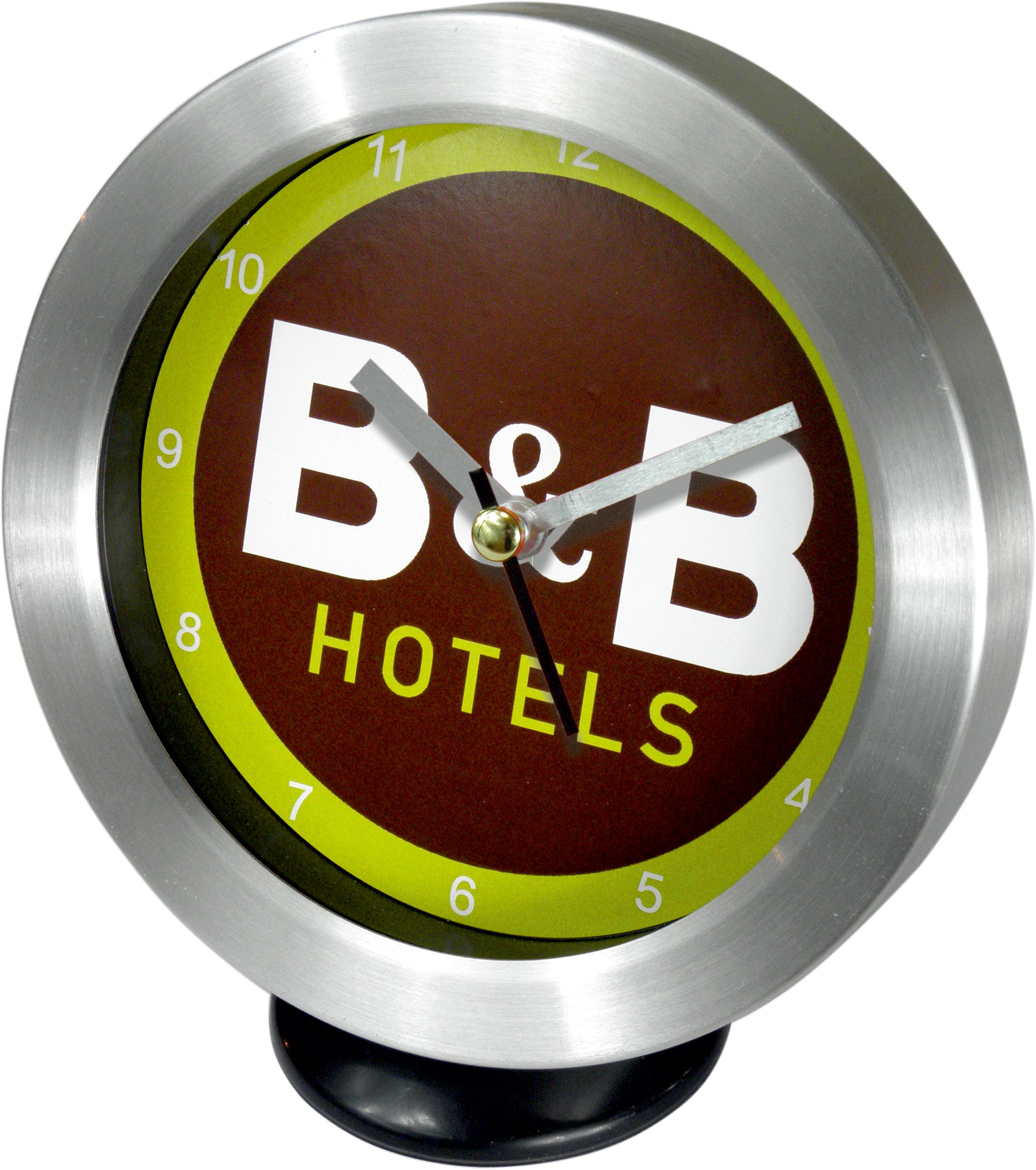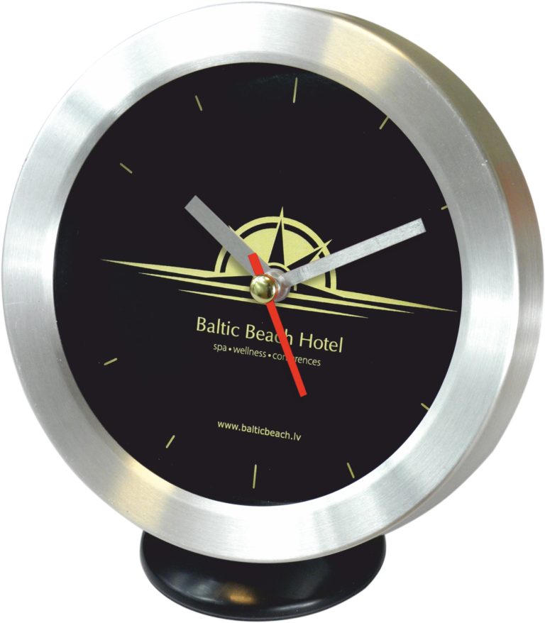 Alumiiniumist lauakell mineraalklaasiga. Võimalus panna sihverplaadile mis tahes kujundus vastavalt individuaalsele projektile. Kell on pakitud mullikilesse ja valgesse karpi. Seierid (standard): must, hõbedane. Lisatasu eest mis tahes RAL värvi jaoks.