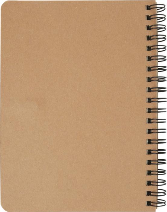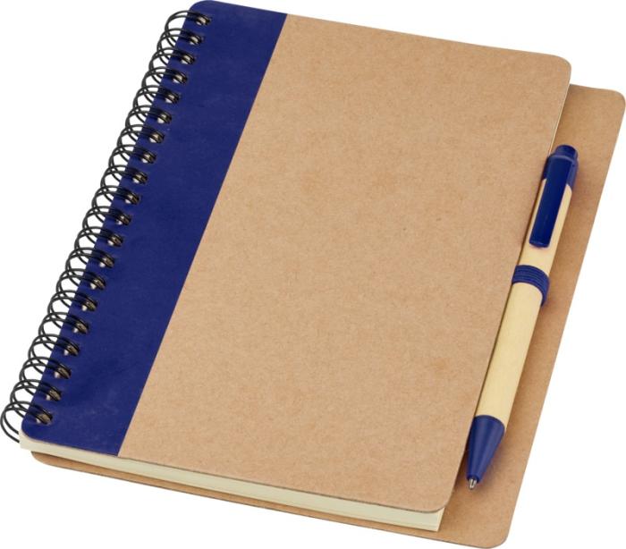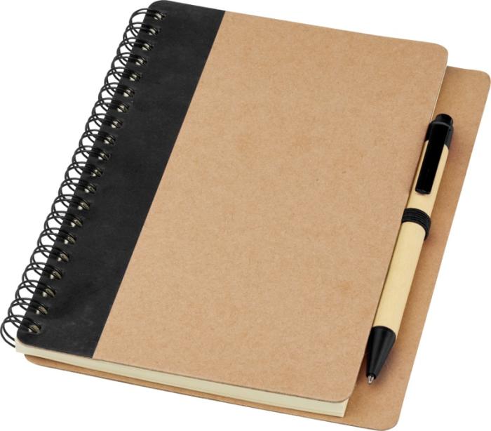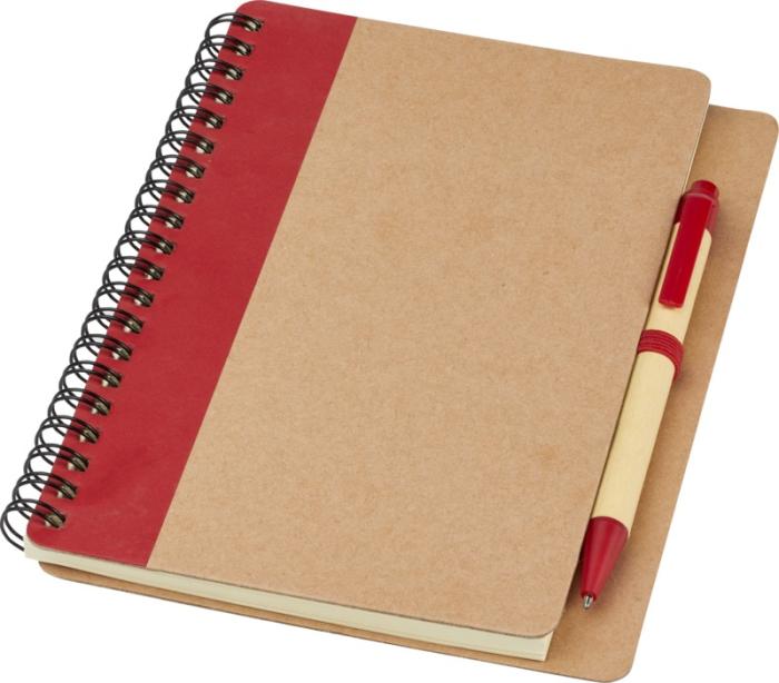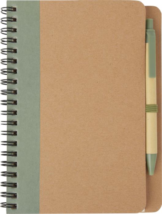 Taaskasutatud paberist kaanega märkmik. 60 joonelist lehte koos märkmikuga sobivas toonis pastapliiatsiga. Pliiatsid pakitud koos märkmikuga. Taaskasutatud paber. Saadaval viies erinevas värvitoonis.
