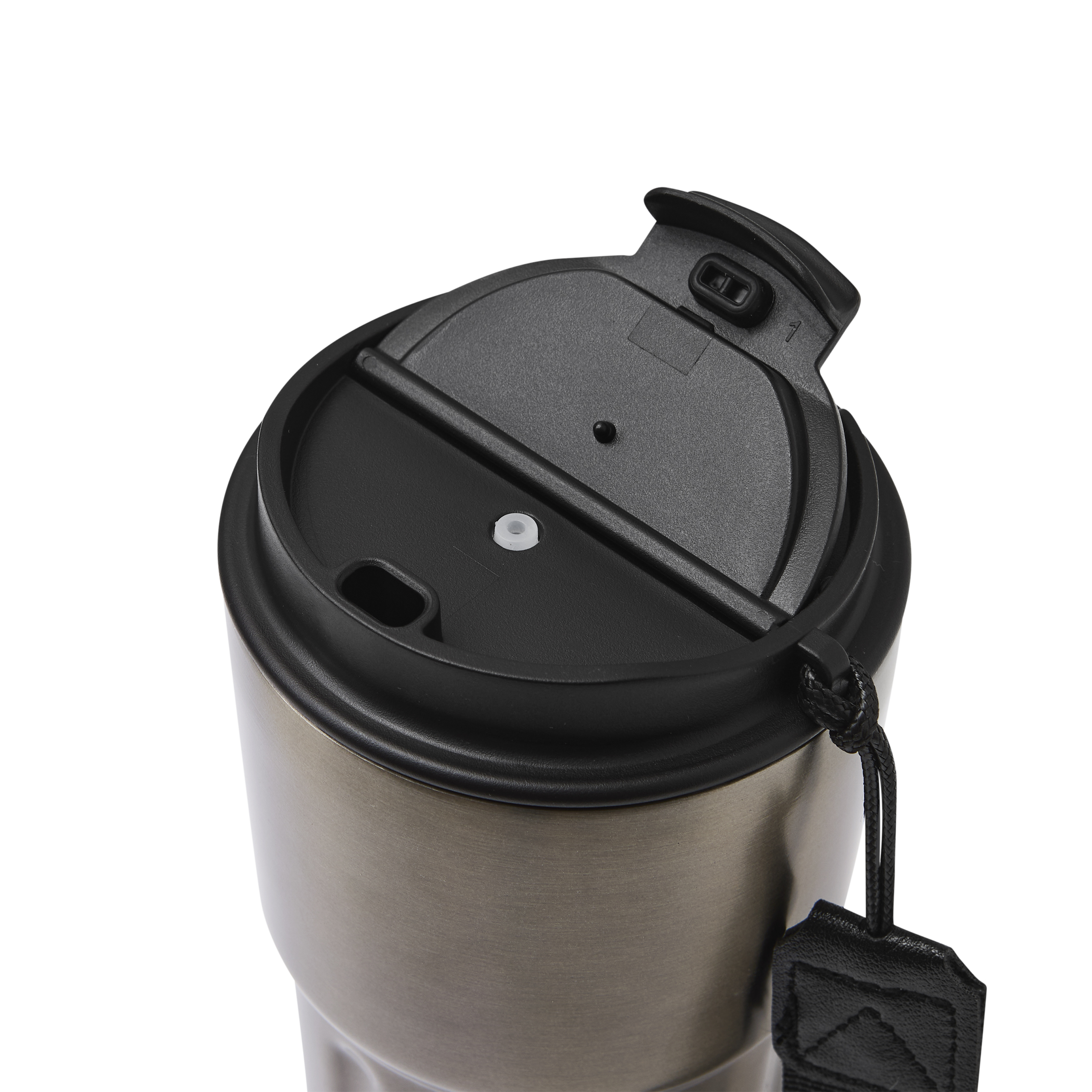 Soojustatud kruus TRAVEL MUG, topeltseinaga: seest ja väljast roostevabast terasest, plastikust kaas kindla keeratava korgiga, silikoontihend ja integreeritud joogiava, mahutavus ca. 400 ml, taaskasutatud plastikust randmerihm.