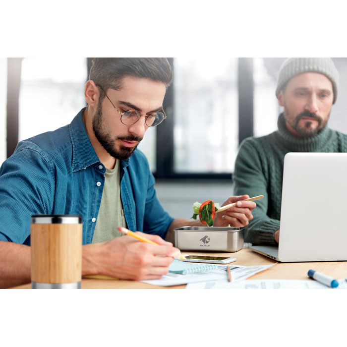 Roostevabast terasest lõunakarp bambusest söögiriistade ja kaanega. Karbil on kinnitatav polüesterriba. Mahutavus 600 ml. Bambus on looduslik toode, seega esemete värvides ja suurustes võivad olla väikesed erinevused, mis võivad mõjutada lõplikku kaunistuse tulemust.