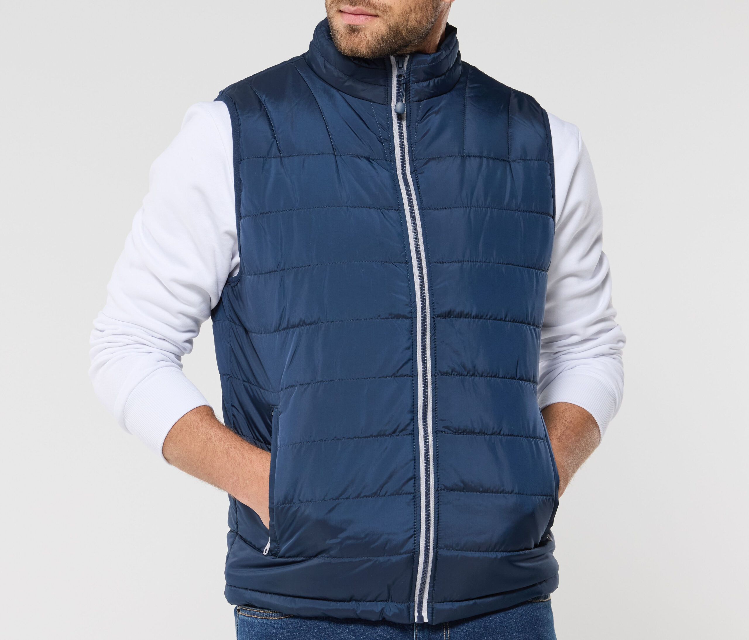 Trendikas vest. Vetthülgav ja tuulekindel. Ees täispikk lukk ja vasakul sisetasku brändingu jaoks. Vesti saab täielikult kokku pakkida ja hoiustada paremas sisetaskus, millel on takjakinnitus. Pingutusnöör vöökohal. Käeaugud ääristatud. 2 külgmist klappidega lukuga taskut. Õmbluste vahekaugus 6,5 cm.