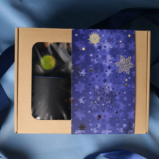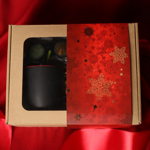 Kruus on pakitud koos väikeste šokolaadide (erinevad maitsed) ja talveteemalises tuubis oleva teega (roheline Sencha tee kirsside ja roosi kroonlehtedega) kenasse kartongkarpi, mille ümber kinkepael või talvise trükiga “sleeve” ümbris.
